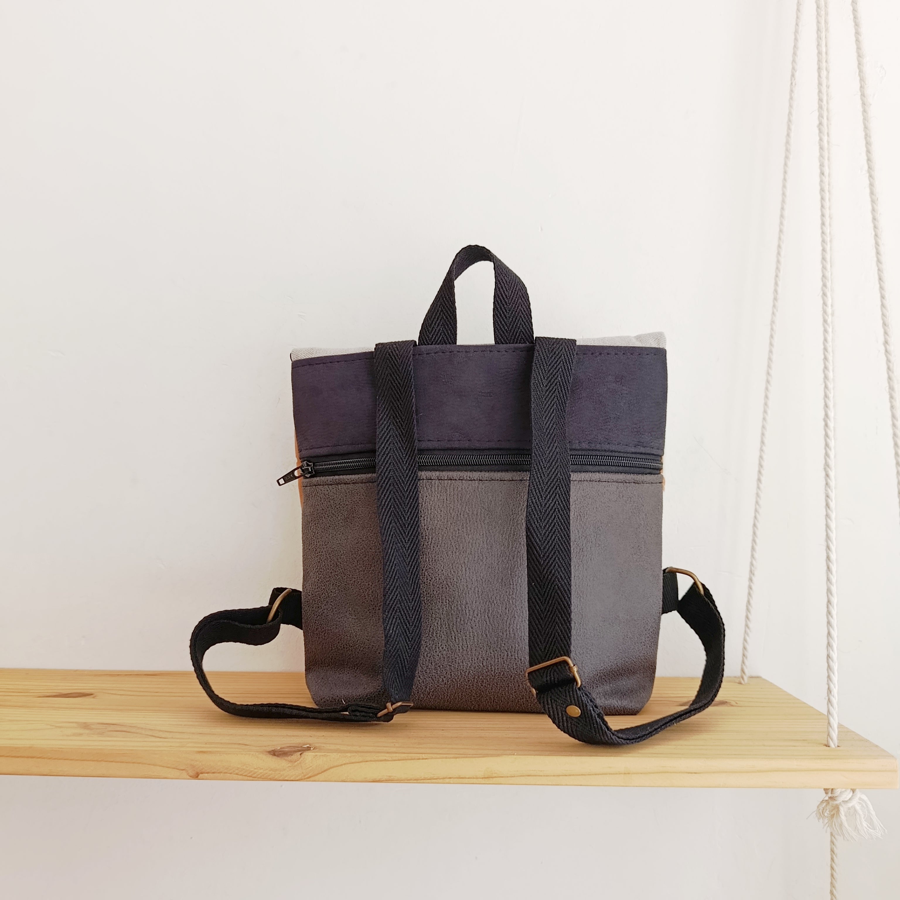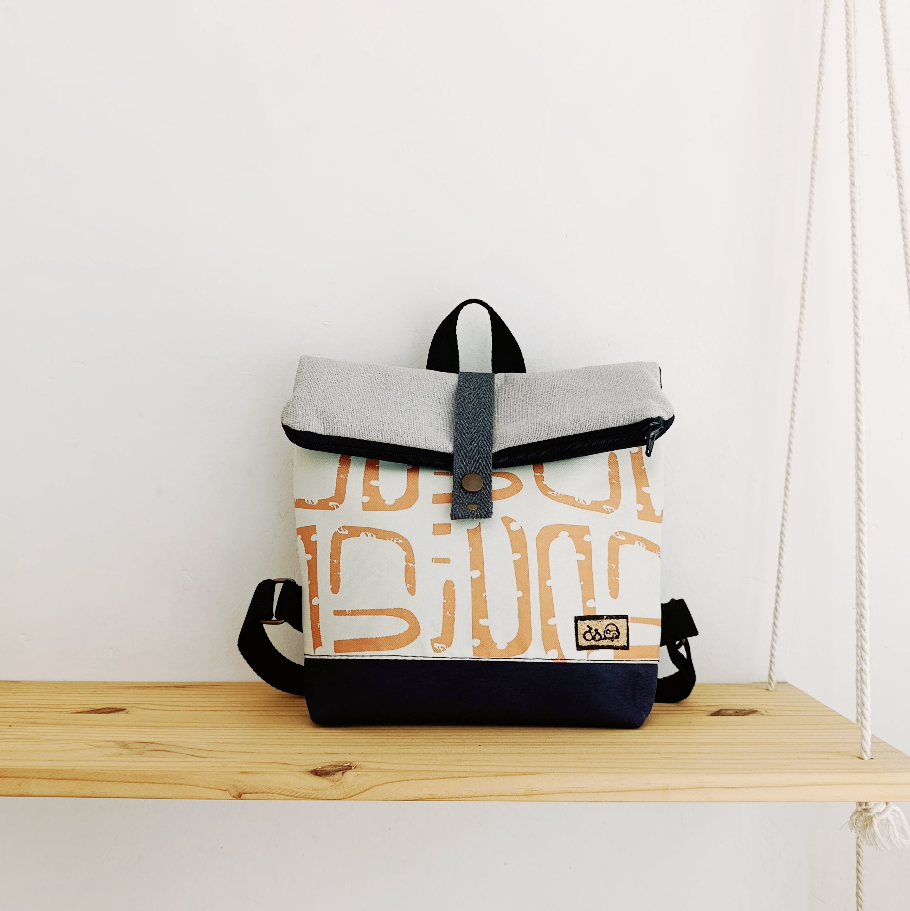Mochila de solapa con formas orgánicas naranjas y juego de grises