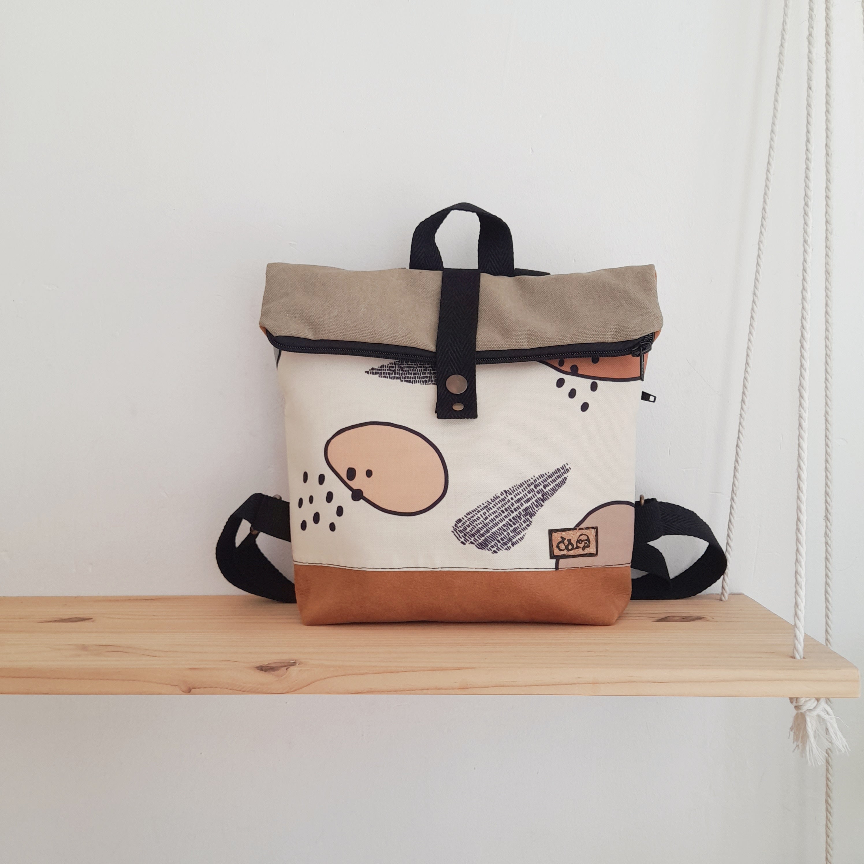 Mochila de solapa con formas y líneas, camel y beige