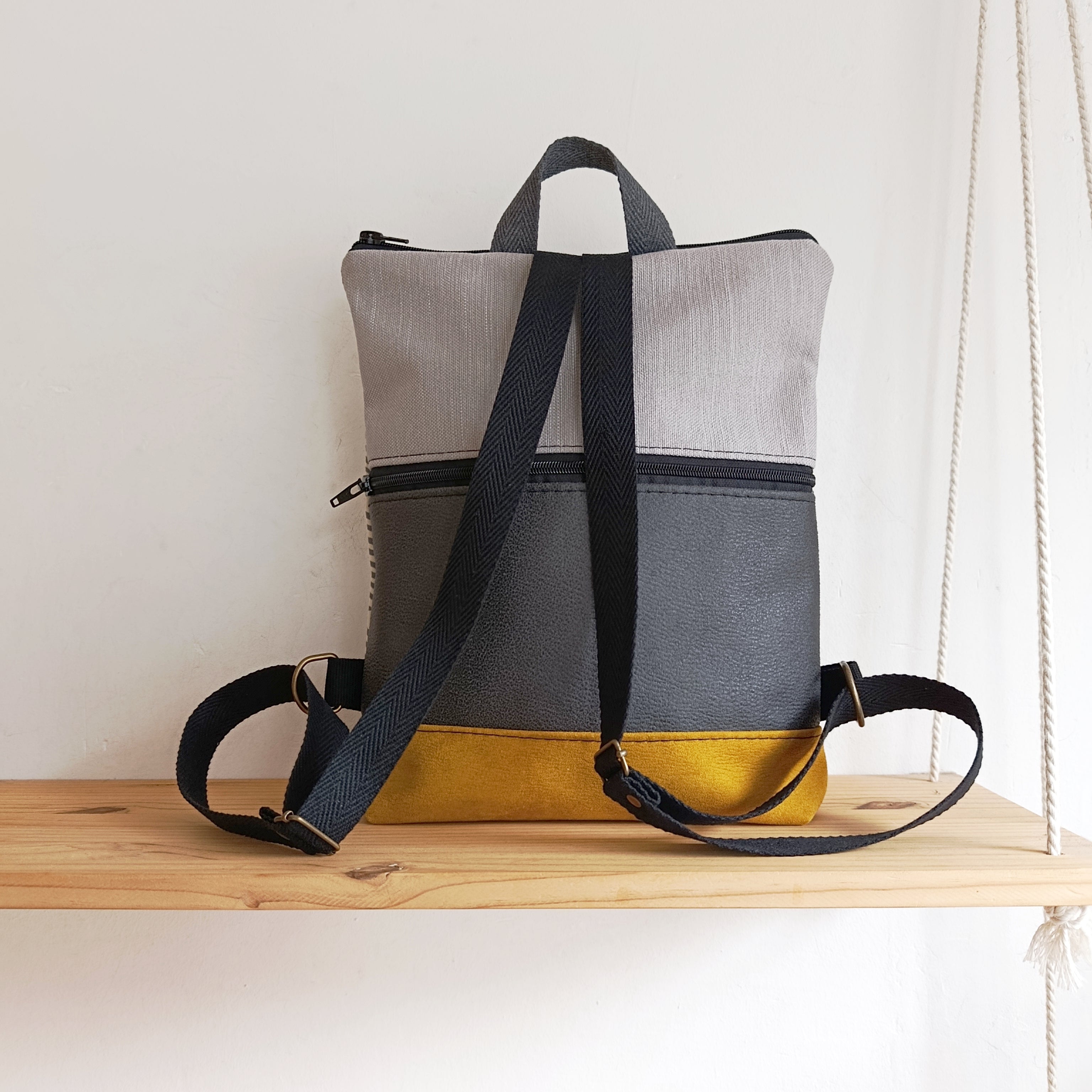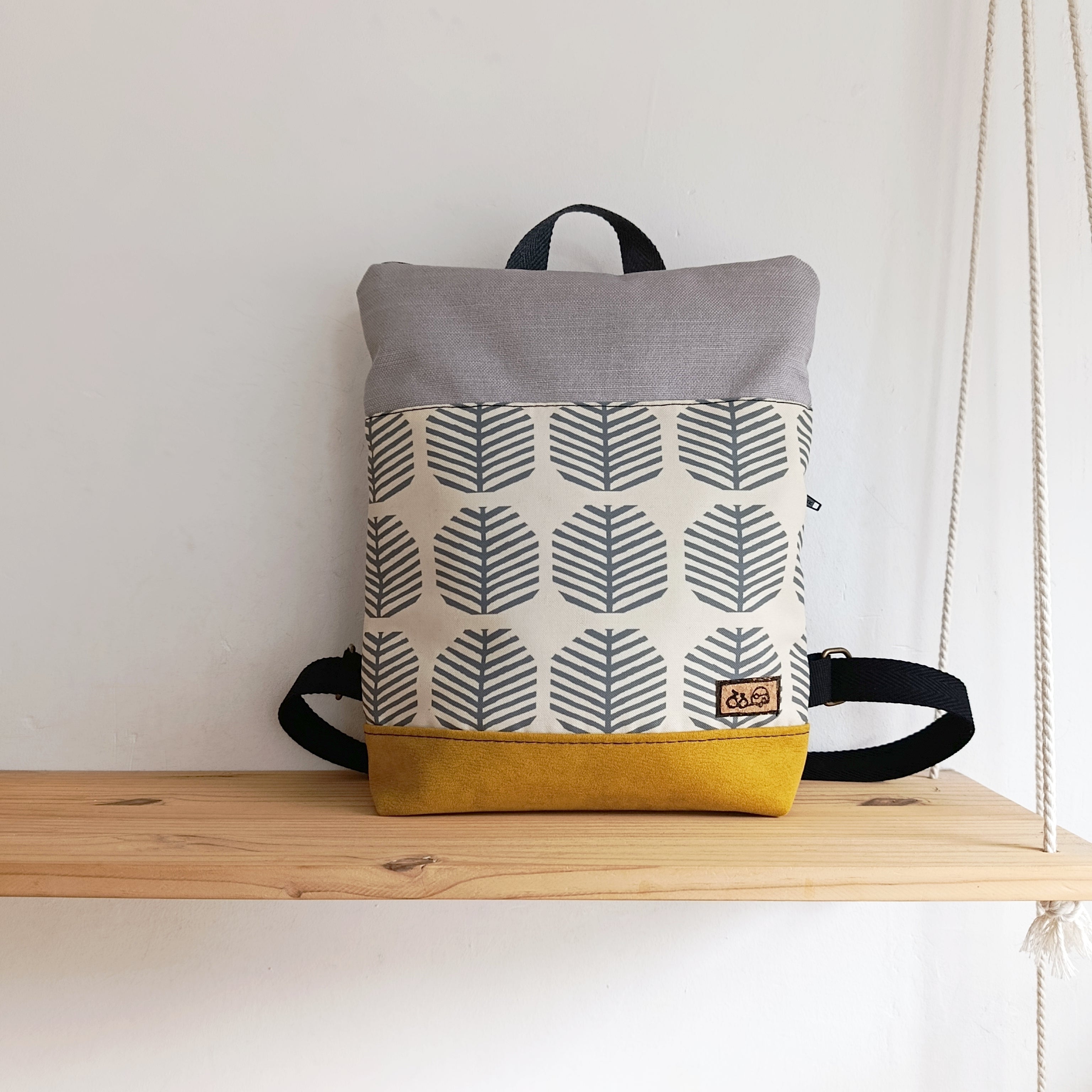 Mochila rectángulo con arbolillos grises, mostaza y gris claro
