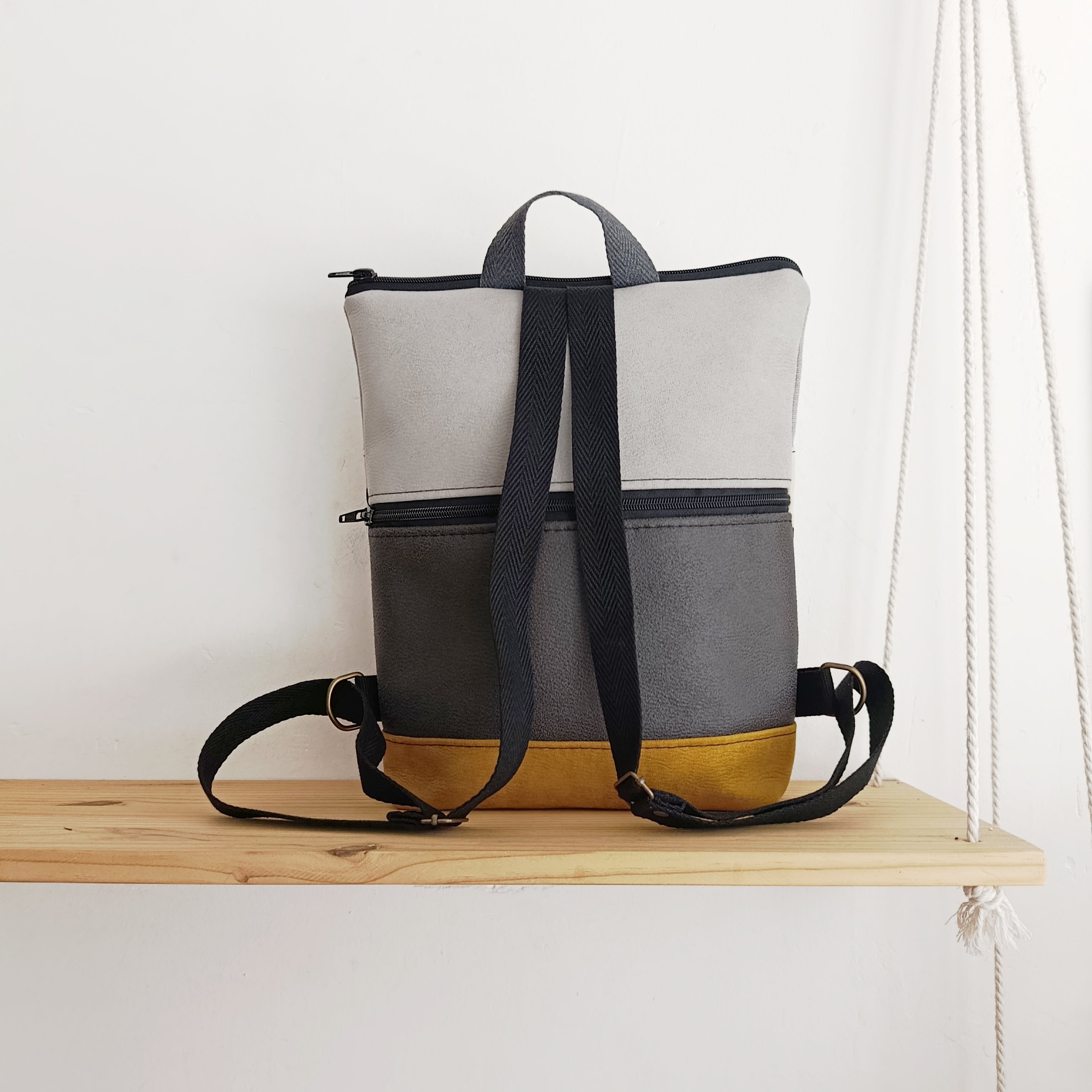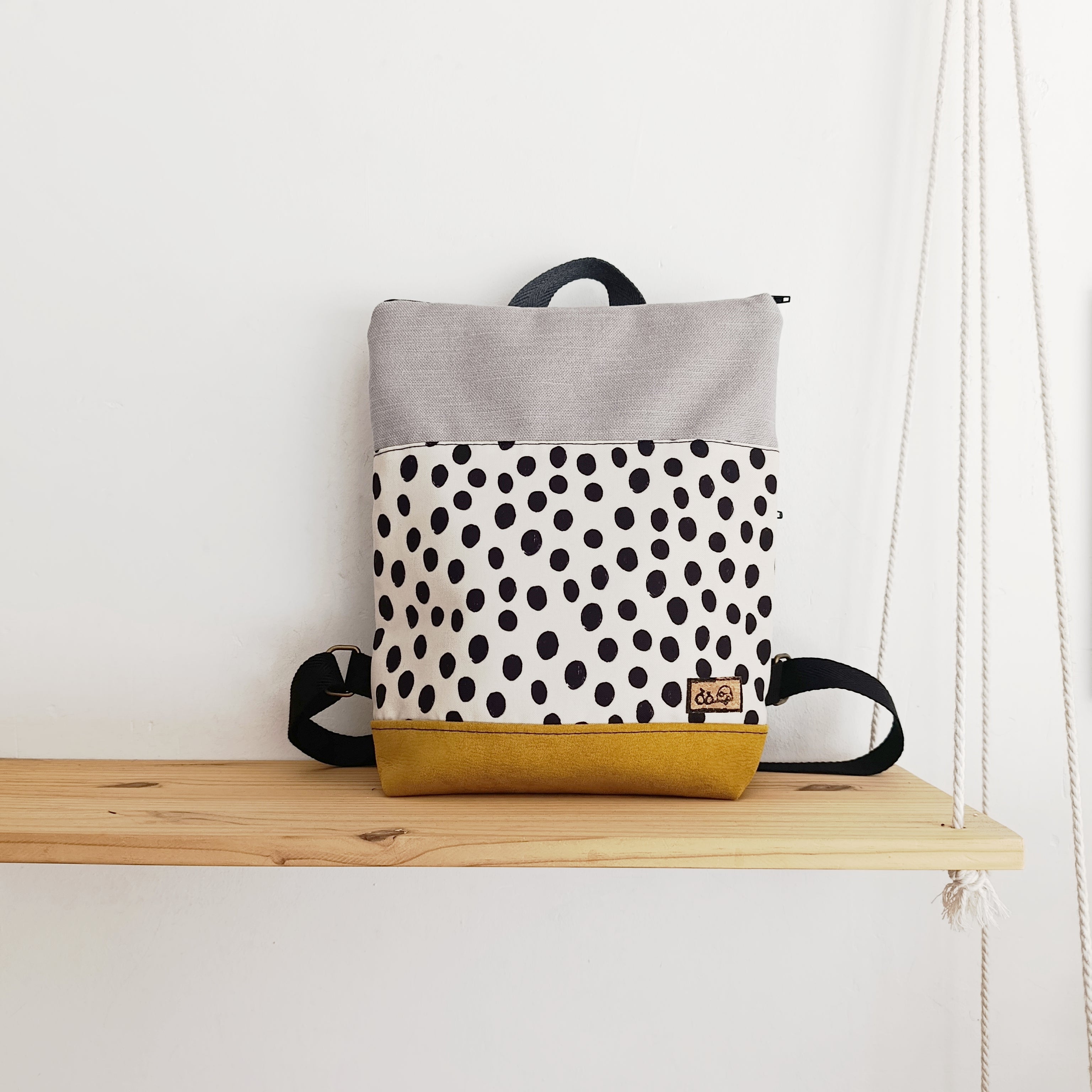 Mochila rectángulo con circulitos, mostaza y gris claro